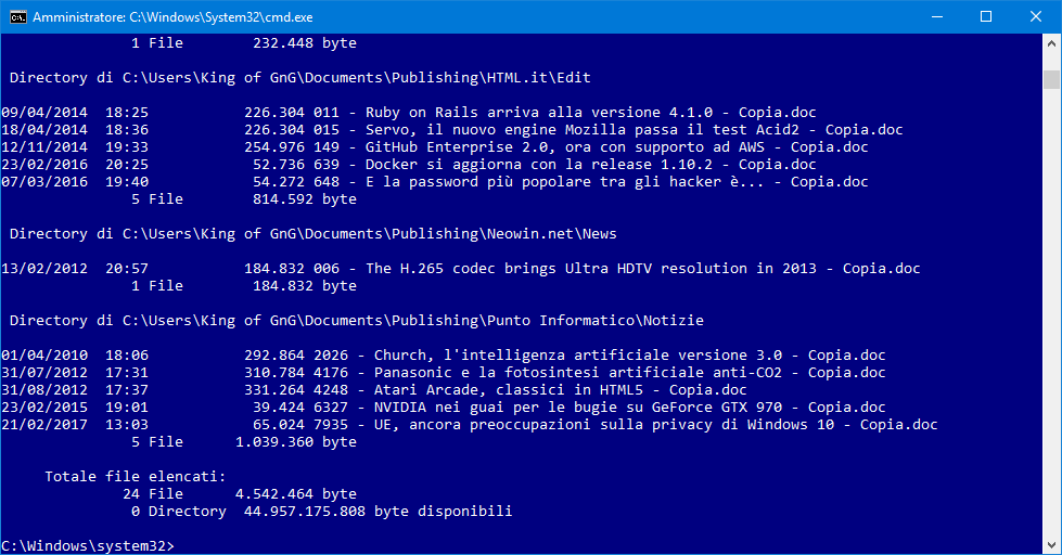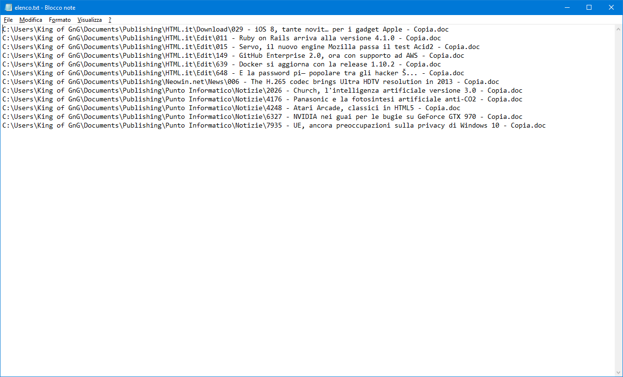 Aggiustando ulteriormente il comando di ricerca tramite il parametro /b (per visualizzare esclusivamente i nomi dei file senza riepiloghi o informazioni aggiuntive) e reindirizzando l’output verso un file salvato su disco con il comando dir \*copia.doc /a /b /s > \elenco.txt da una shell testuale con privilegi elevati, potremo poi ottenere un documento testuale contenente tutti i file incriminati (al netto dei duplicati “virtuali” dovuti all’impiego dei link simbolici) che potremo infine impiegare per effettuare la procedura di rinomina (eliminando l’inutile e antiestetico suffisso “- Copia”) attraverso la programmazione di un listato Batch o manualmente.