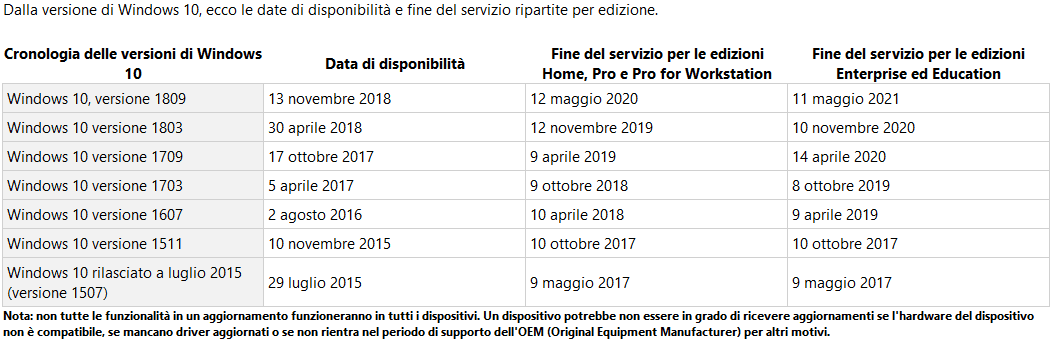 Altre informazioni interessanti sono quelle riguardanti le versioni LTSC/LTSB di Windows Enterprise, edizioni “speciali” distribuite una volta ogni 2-3 anni e per cui è garantito un supporto di 10 anni (5 anni di supporto base+5 anni di supporto esteso). La versione LTSB di Windows 10 Enterprise 2015 riceverà aggiornamenti fino al 14 ottobre 2025, mentre Windows 10 Enterprise LTSC 2019 verrà aggiornato fino al 9 gennaio 2029.