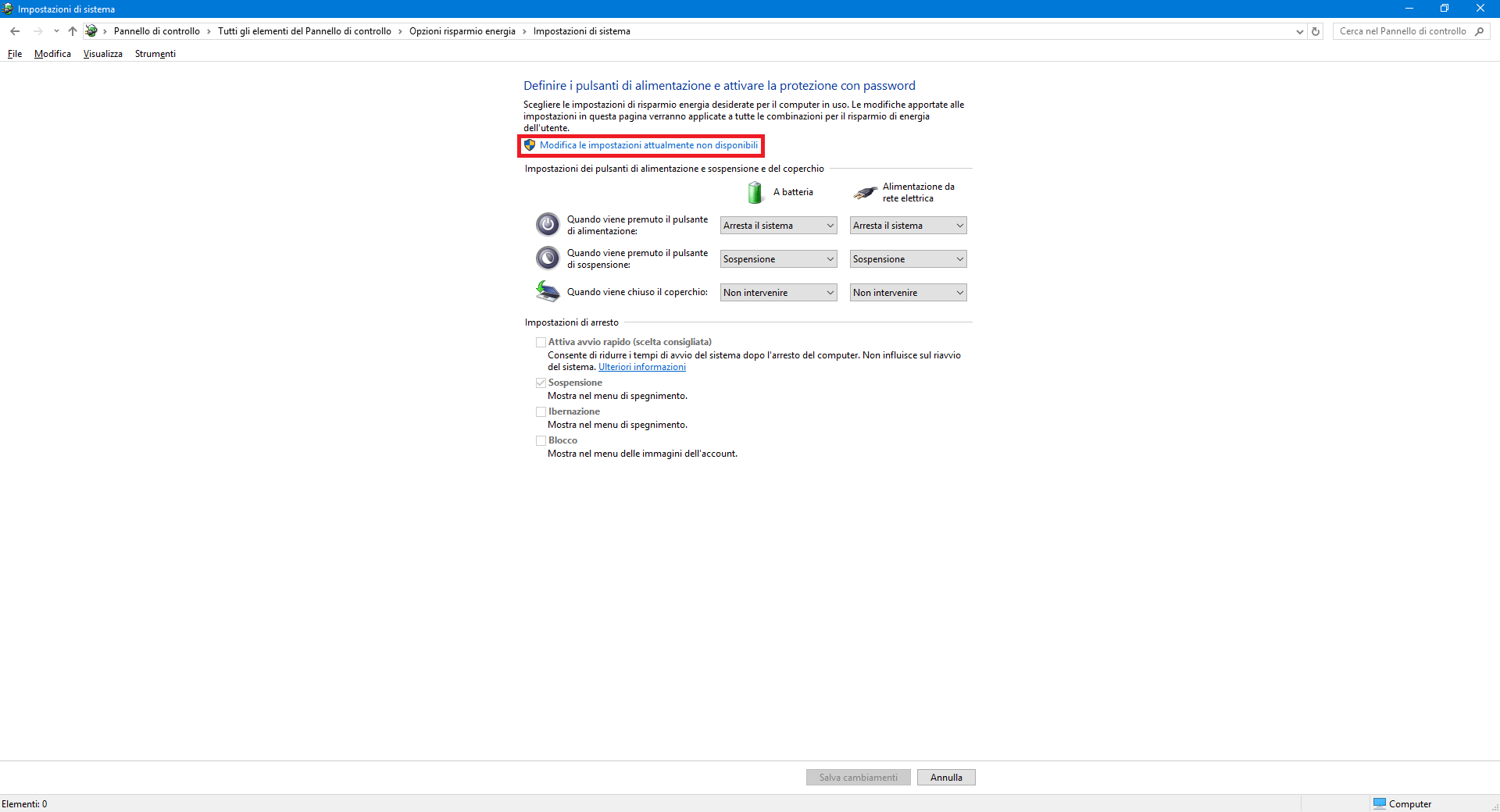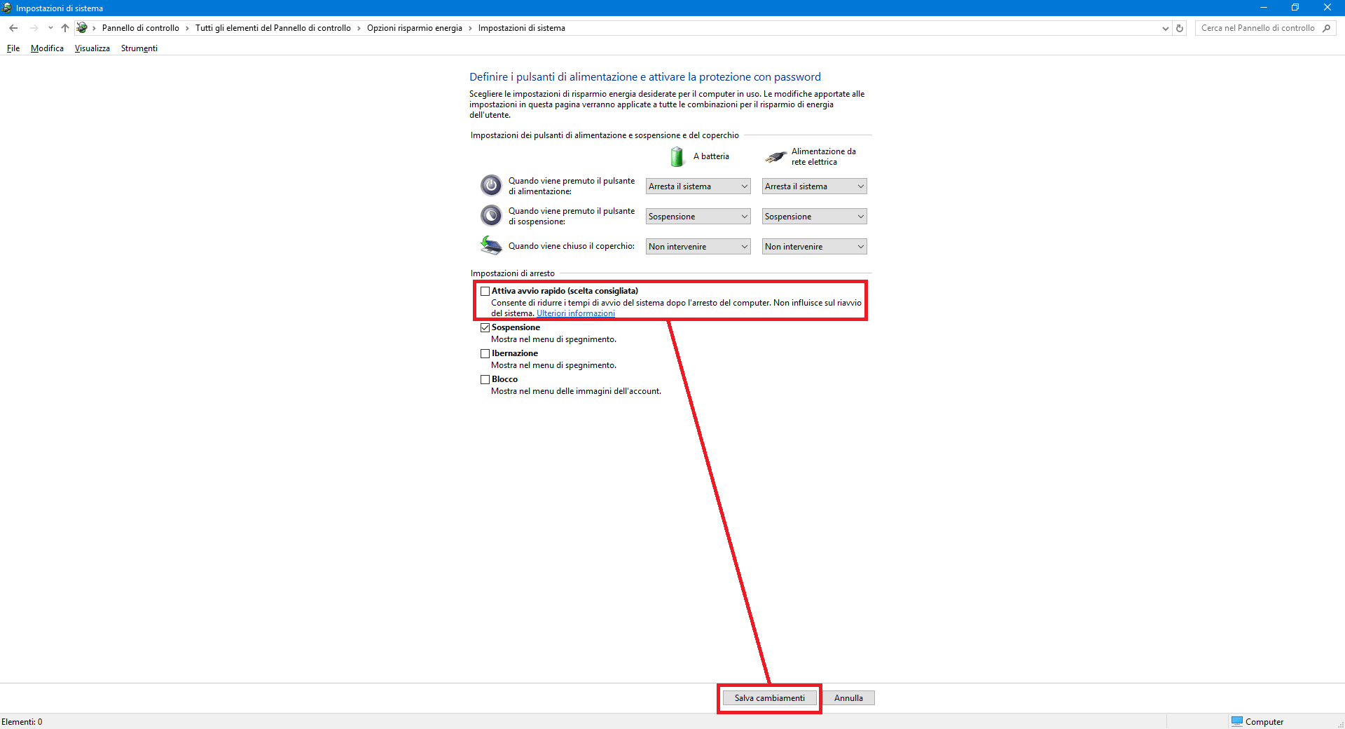 Qualora ci trovassimo in una delle situazioni testé descritte, o volessimo semplicemente avviare sempre una nuova sessione “pulita” di Windows perché abbiamo a disposizione un disco di sistema veloce (SSD) e aspettare qualche secondo in meno non ci cambia certo la vita, possiamo disabilitare l’opzione di Avvio Rapido accedendo al Pannello di Controllo classico (anche su Windows 10), alle Opzioni risparmio energia e selezionando Specifica comportamento pulsanti di alimentazione dal menù sulla sinistra. Selezioniamo la voce Modifica le impostazioni attualmente non disponibili per poter modificare le Impostazioni di arresto in basso, infine togliamo la spunta accanto all’opzione Attiva avvio rapido (scelta consigliata) e salviamo le modifiche facendo click col mouse sul pulsante Salva cambiamenti in basso.