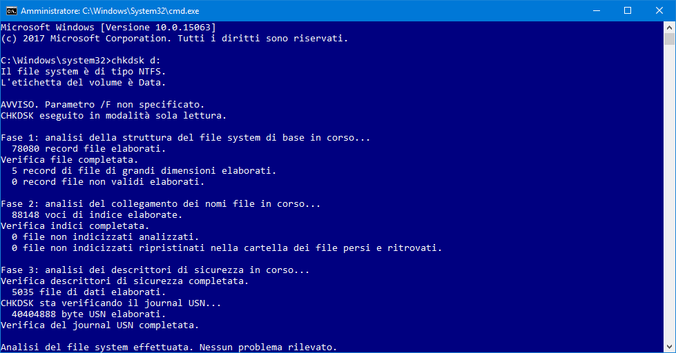 Uno dei casi in cui questo limite risulta più evidente è ad esempio quando apriamo la shell a riga di comando di Windows 10 (cmd.exe), provando poi a eseguire l’utility di controllo dei dischi: senza i privilegi admin, tutto quello che otterremo sarà un messaggio di “Accesso negato” come quello rappresentato in figura.