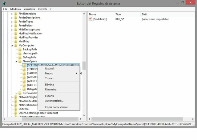 Le sue sottochiavi, come noterete, sono stringhe Guid (Globally Unique Identifier, un numero a 128 bit memorizzato come stringa esadecimale suddivisa in cinque blocchi separati da trattini), che identificano le cartelle mostrate nella finestra Questo PC. Salvate per sicurezza il contenuto corrente della chiave NameSpace, facendo clic destro e selezionando Esporta nel menu contestuale; poi rimuovete i Guid delle cartelle che non volete vedere comparire in Questo PC; ecco l’elenco delle corrispondenze: