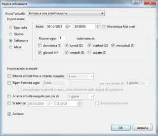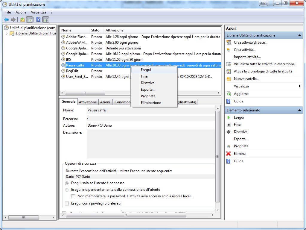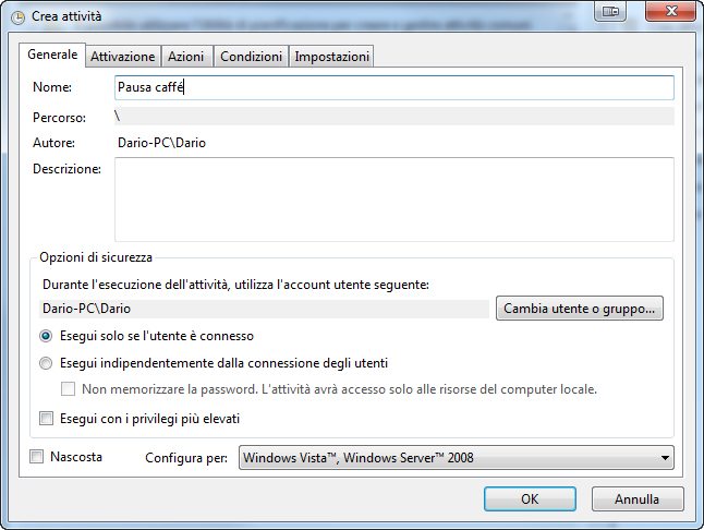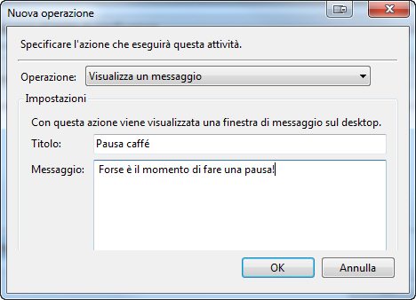 Aprite il menu Start e richiamate l’Utilità di pianificazione, digitando pianificazione nella casella di ricerca. Fate clic sulla voce Crea attività , nel pannello Azioni che si trova lungo il margine destro della finestra (figura A). Inserite una denominazione significativa nella casella Nome della scheda Generale (figura B) e poi passate alla scheda Attivazione. Fate clic su Nuovo per specificare quando attivare la sveglia: per creare un evento attivo solo durante i giorni lavorativi selezionate Settimana nella sezione Impostazioni, aggiungete segni di spunta accanto ai giorni feriali e indicate l’orario nella sezione Inizio (figura C). Per riproporre lo stesso evento a intervalli regolari aggiungete un segno di spunta accanto all’opzione Ripeti l’attività ogni, nella sezione Impostazioni avanzate. Confermate le impostazioni con un clic su OK e passate alla scheda Azioni. Anche in questo caso fate clic su Nuova per aprire la finestra di configurazione; selezionate Visualizza un messaggio nella casella a discesa Operazione e inserite i testi nei campi Titolo e Messaggio (figura D). Confermate con un clic su OK e chiudete la finestra di configurazione. Per testare l’attività appena creata evidenziate Libreria Utilità di pianificazione nell’elenco ad albero di sinistra, fate clic destro sulla voce appena creata e selezionate la voce Esegui (figura E).
