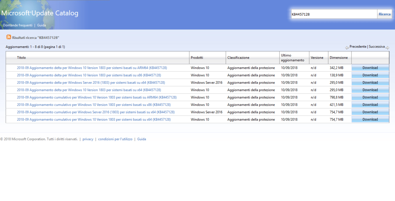 Entrando più in dettaglio nelle patch rilasciate da Microsoft in questo mese di settembre 2018, i seguenti pacchetti di aggiornamento sono disponibili per il download sul Catalogo Ufficiale della corporation: