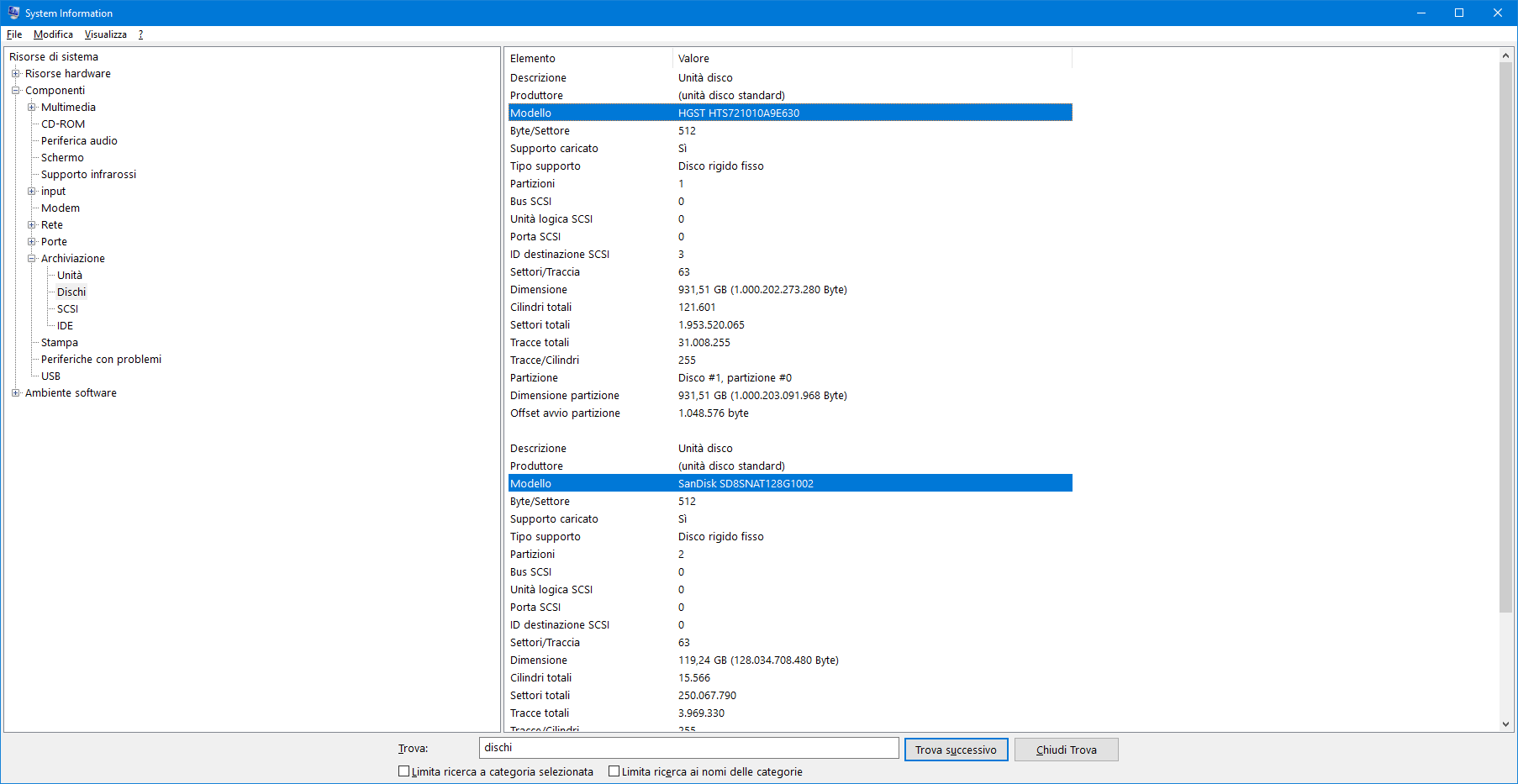 Limitandoci al solo comparto dello storage, System Information è in grado di “spifferare” il nome del produttore e del modello, le dimensioni, le configurazione fisica e altri dettagli particolareggiati delle unità di archiviazione attualmente collegate al sistema. Una volta avviata l’utility, le informazioni che ci interessano si trovano navigando (tramite il menu sulla sinistra) in Componenti, Archiviazione e infine Dischi. Una modalità di accesso alternativa prevede l’uso della funzionalità “trova”, in basso nell’interfaccia di MSInfo, fornendo il parametro “dischi” e avviando la ricerca con l’apposito pulsante.