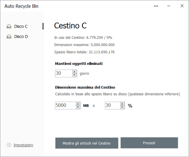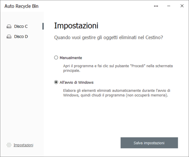 La schermata delle opzioni (raggiungibili tramite la voce Impostazioni in basso a sinistra) è sicuramente il “cuore” di Auto Recycle Bin, visto che da qui è possibile indicare se vogliamo procedere con le operazioni manuali del programma oppure desideriamo applicare le nostre regole di ritenzione “All’avvio di Windows” (opzione tra l’altro attiva di default).