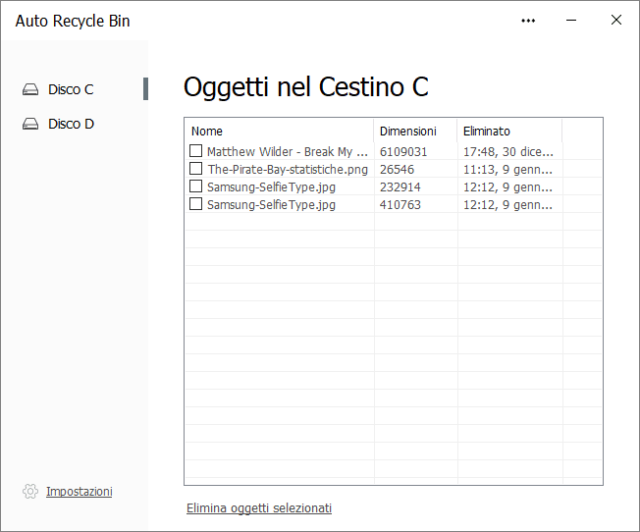 Tramite il pulsante Mostra gli articoli nel Cestino è dunque possibile visionare la lista ed eventualmente selezionare i file che desideriamo cancellare, mentre con il pulsante Procedi è possibile applicare le regole di ritenzione specificate (numero di giorni e dimensioni) al Cestino del drive selezionato.