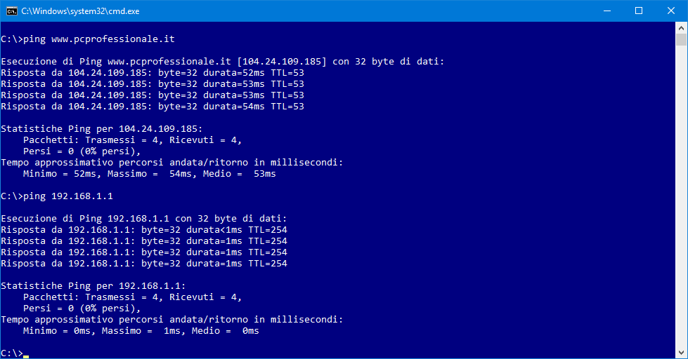 Una volta aperta una finestra della shell testuale di Windows (Tasto Windows+R, cmd, Invio), il comando ping può essere impiegato per testare la raggiungibilità di un nome di dominio remoto (ad esempio ping www.pcprofessionale.it) o per verificare la connessione del sistema con il router domestico (es. ping 192.168.1.1); nel primo caso ping è anche in grado di restituire l’indirizzo IP fisico corrispondente al dominio testato. Alla fine del “sondaggio”, una breve serie di statistiche fornisce informazioni sul numero di pacchetti trasmessi e ricevuti, i pacchetti persi e i tempi minimo/medio/massimo di andata/ritorno dei pacchetti di dati in millisecondi.