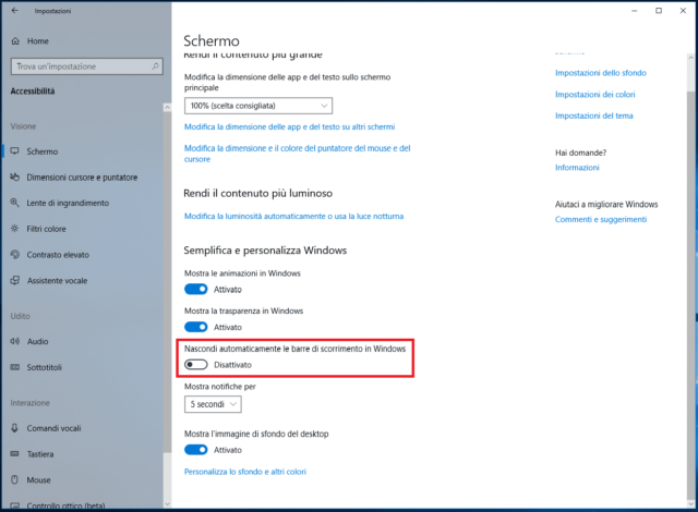 A partire dall’aggiornamento noto come April 2018 Update, Windows 10 ha però aggiunto un’opzione che permette di mostrare sempre le barre di scorrimento nelle app di Windows. Per attivare il nuovo comportamento basta accedere alla app Impostazioni (dal Menu Start), selezionare Schermo sulla colonna a sinistra e quindi disabilitare l’opzione Nascondi automaticamente le barre di scorrimento in Windows.