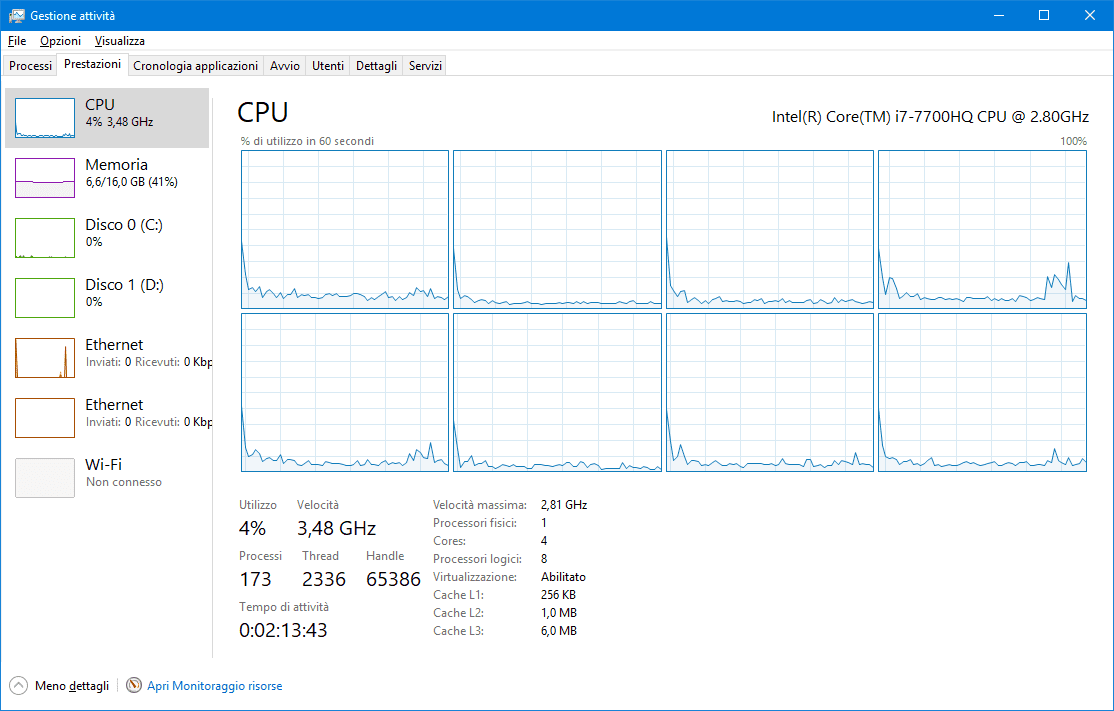 Per riportare il Task Manager alla visualizzazione normale basterà fare doppio clic col mouse su un punto della finestra in modalità compatta. E se volessimo limitare l’analisi real-time a un particolare componente del sistema, basterà selezionare tale componente (CPU, disco, Ethernet o altro) sulla sinistra e quindi fare doppio clic su un punto nella parte destra della finestra.