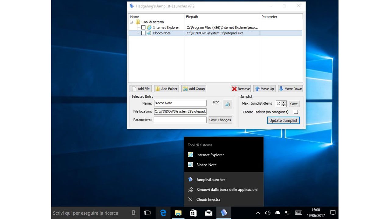 Un esempio di cosa potete fare sfruttando le potenzialità di Jumplist Launcher. Un’icona della barra delle applicazioni di Windows può essere arricchita di nuove funzioni raggiungibili in modo semplice e rapido.