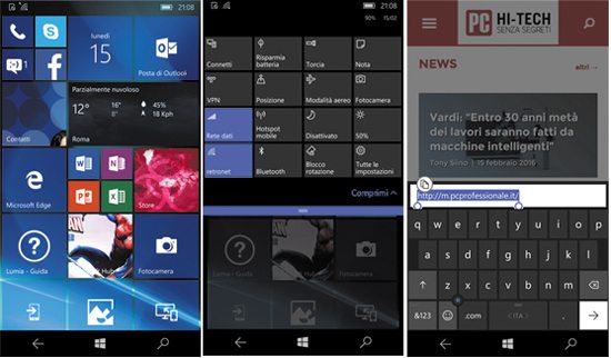 Da sinistra, l’aspetto standard della home di Windows 10, ampiamente personalizzabile nel numero e nel tipo di elementi; il completo pannello a scorrimento che mostra le impostazioni rapide; la comoda tastiera integrata con evolute funzioni di copia/incolla.