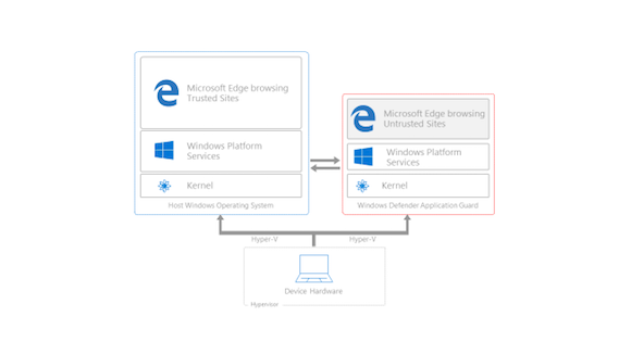 La nuova modialità di esecuzione che si chiamerà Windows Defender Application Guard per Microsoft Edge sfrutta le potenzialità del sistema di sicurezza delle macchine virtuali che Microsoft ha introdotto la scorsa estate con Windows 10. La tecnologia impiegata dalla casa di Redmond e denominata Virtualizazion Based Security (VBS) utilizza ambienti virtuali di piccole dimensioni che si appoggiano all’hypervisor Hyper-V per isolare processo critici e potenzialmente pericolosi dal resto del codice del sistema operativo.