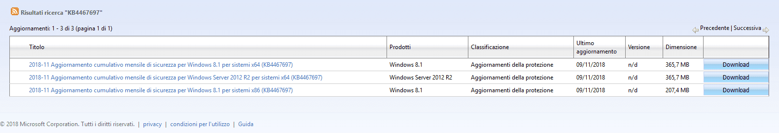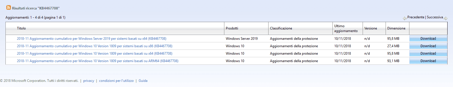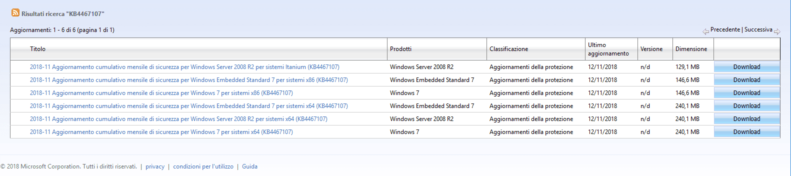 Entrando più in dettaglio nelle patch rilasciate da Microsoft durante il mese di novembre 2018, i seguenti pacchetti di aggiornamento sono disponibili per il download sul Catalogo Ufficiale della corporation:
