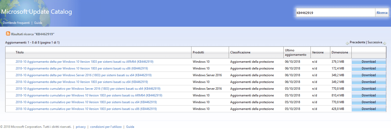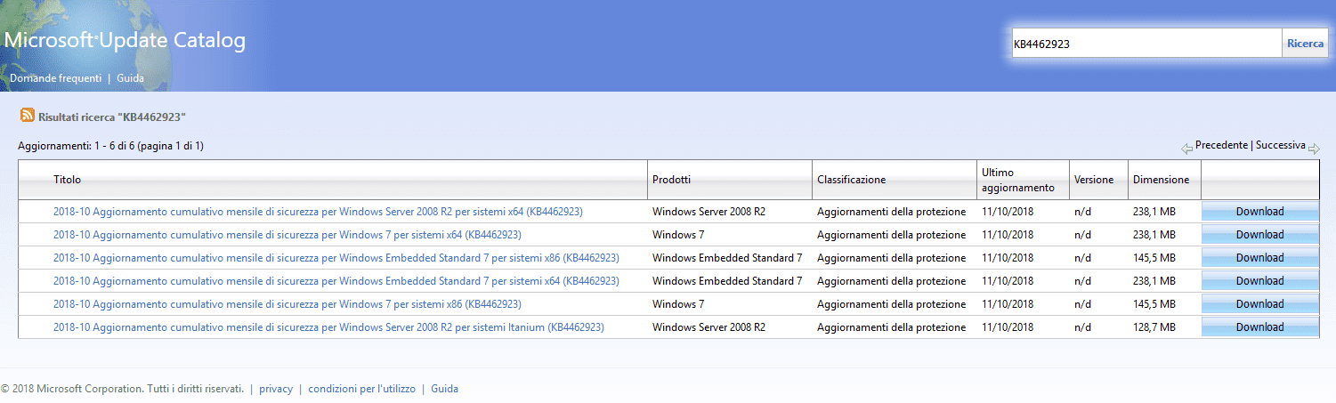 Entrando più in dettaglio nelle patch rilasciate da Microsoft durante il mese di ottobre 2018, i seguenti pacchetti di aggiornamento sono disponibili per il download sul Catalogo Ufficiale della corporation: