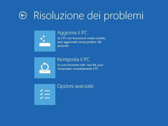 Procedete come se voleste installare il sistema operativo: dopo la fase di caricamento iniziale, verificate che le opzioni relative alla lingua e al layout della tastiera siano corrette; poi selezionate Avanti nella prima schermata. Fate clic sul collegamento Ripristina il computer, selezionate Risoluzione dei problemi e poi Opzioni avanzate per accedere alle opzioni di ripristino.