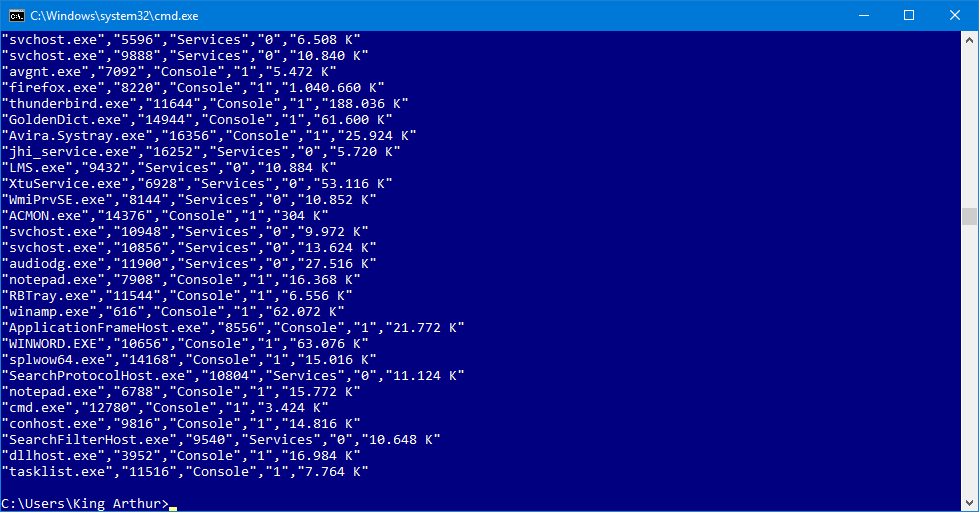 Il risultato più immediato del comando tasklist è la visualizzazione senza interruzioni dell’elenco dei processi attualmente in memoria prima del ritorno al prompt; per elencare i processi una pagina alla volta possiamo aggiungere i parametri |more, mentre per salvare una copia dell’elenco dei processi possiamo redirigere l’output verso un file testuale con tasklist > "c:\lista processi.txt" o un comando similare. In questo caso potrebbe essere necessario elevare i privilegi della shell per non imbattersi in un errore di “accesso negato”.