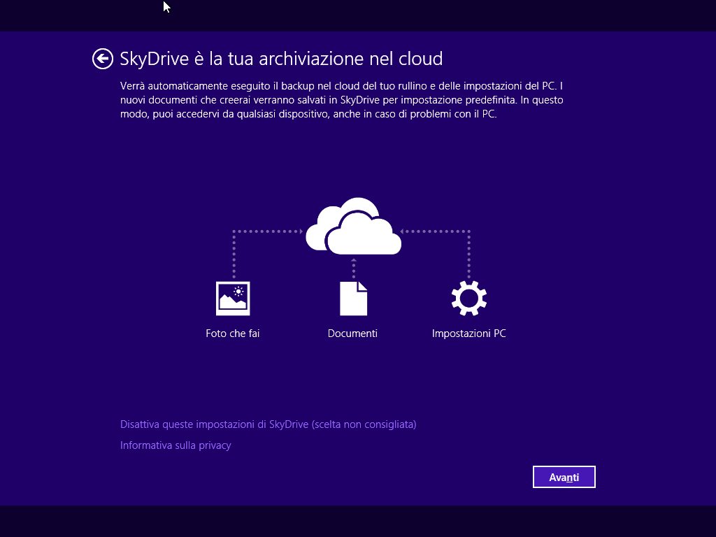 Con Windows 8.1 il servizio di cloud storage SkyDrive è stato integrato molto più in profondità nel sistema operativo: il disco remoto è addirittura proposto come destinazione di salvataggio predefinita per le applicazioni. L’attivazione di queste funzioni avviene direttamente durante l’installazione del sistema operativo (figura A) ma, come vedremo, si può modificare questa impostazione in un secondo momento, anche se l’opzione che controlla l’integrazione non è facile da individuare.
