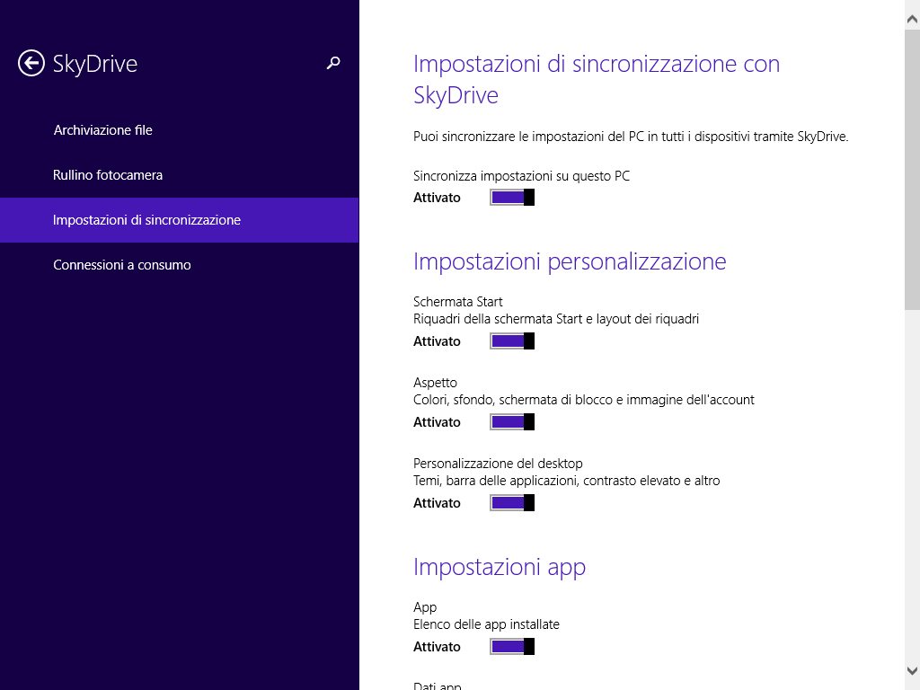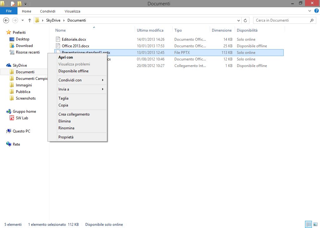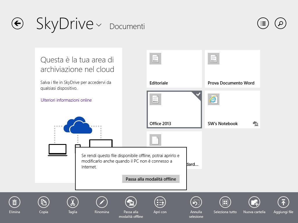 I contenuti remoti sono disponibili sia utilizzando l’App Modern, preinstallata per default, sia dal desktop: finalmente, infatti, i file e le cartelle di SkyDrive possono essere visualizzate anche all’interno del file system tradizionale e non è necessario installare un client specifico come quello progettato per le versioni precedenti di Windows. Rispetto al vecchio client di sincronizzazione, però, entrambe le interfacce mostrano una differenza sostanziale: per default permettono di sfogliare i contenuti remoti e di accedere ai file soltanto se è presente una connessione a Internet. In realtà questa impostazione evita di sprecare spazio prezioso, specialmente nei dispositivi meno capienti, come per esempio i tablet. Si può comunque impostare la sincronizzazione in locale, per poter accedere a file e cartelle specifici anche quando ci si trova offline: vediamo come procedere.