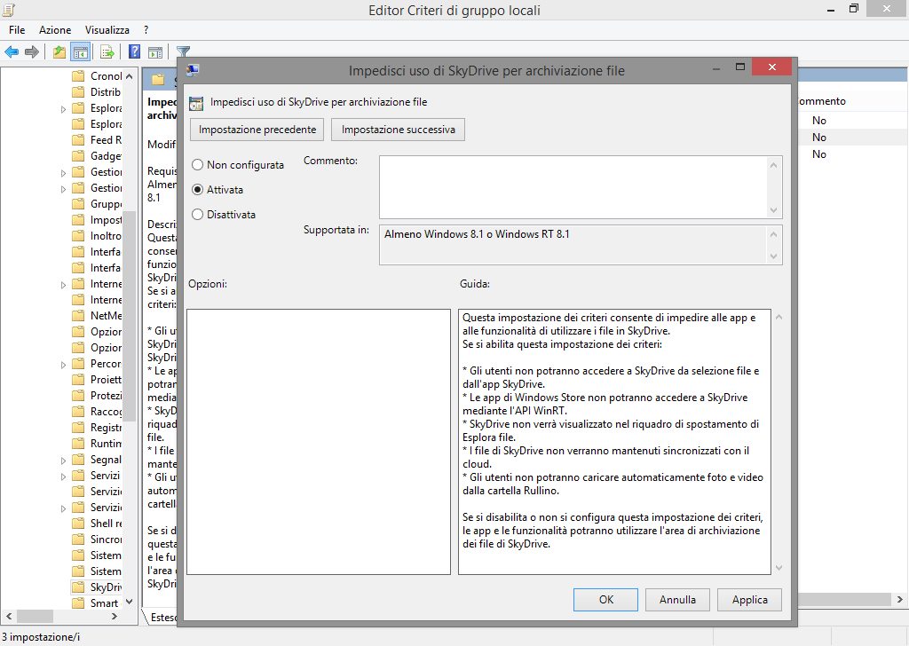 Chi ha acquistato un computer con Windows 8.1 preinstallato e volesse disabilitare l’integrazione con SkyDrive deve passare dall’Editor Criteri di gruppo locali, che è disponibile nelle versioni Pro ed Enterprise del sistema operativo. Vediamo come fare. Aprite la finestra di esecuzione con la scorciatoia Windows+R e digitate gpedit.msc per aprire l’editor dei criteri di gruppo; selezionate Configurazione computer/Modelli amministrativi/Componenti di Windows/SkyDrive e raggiungete la voce Impedisci uso di SkyDrive per archiviazione file. Aprite la finestra di modifica con un doppio clic e selezionate l’opzione Attivata (figura E). Confermate con un clic su OK e chiudete l’editor: qualsiasi riferimento a SkyDrive sparirà subito dall’interfaccia. Per ripristinare la funzione basterà riaprire l’elemento e impostare il criterio di gruppo come Disattivato oppure Non configurato.
