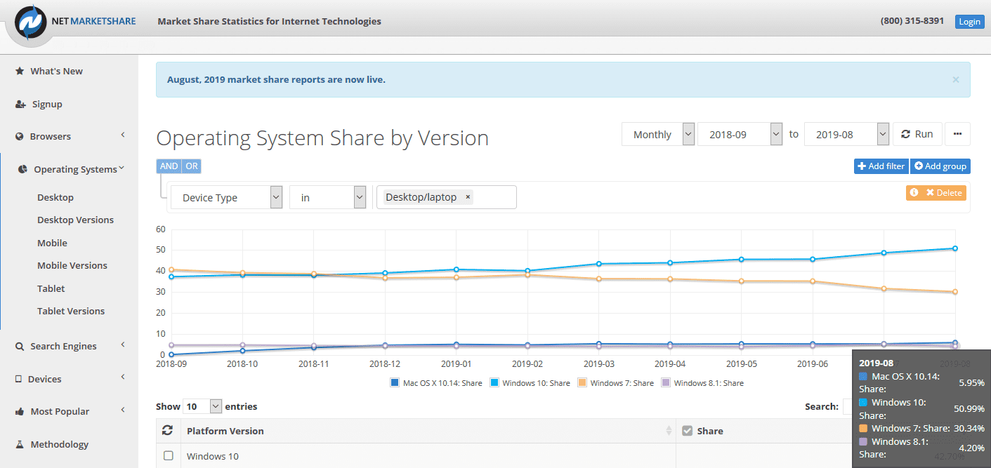 Con una lentezza certo poco apprezzata in quel di Redmond, Windows 10 continua la sua marcia (affatto trionfale) verso la conquista del mercato dei sistemi operativi per PC. Le stime aggiornate di NetMarketShare confermano: ad agosto 2019, l’ultimo OS Microsoft ha superato il fatidico 50% di market share mentre Windows 7 arretra ma tiene ancora botta.
