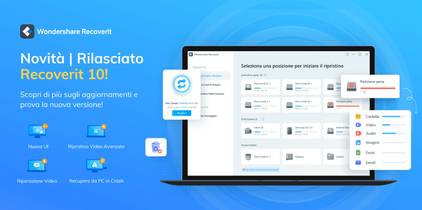 Wondershare Recoverit viene aggiornato alla versione 10.0 e introduce funzioni avanzate di recupero video, permettendo agli utenti di ripristinare video HD, Ultra HD, 4K e 8K senza corruzione dei dati. Inoltre, ha anche migliorato le esperienze degli utenti nel recupero del computer, la riparazione video e l’interfaccia utente.