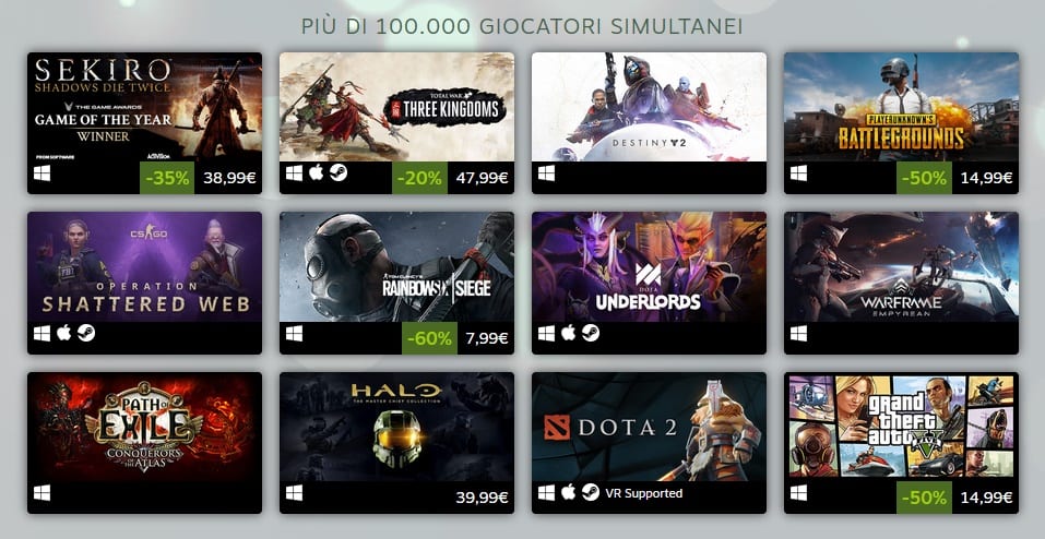 Un altro elenco molto interessante è poi quello dei titoli più giocati del 2019, ovvero i giochi con il maggior numero di utenti connessi contemporaneamente ai server di Steam: le esperienze interattive con più di 100.000 giocatori simultanei comprendono Sekiro, Destiny 2, PUBG, Halo, l’action-RPG Path of Exile e ancora GTA V. Di particolare interesse il posizionamento del gioco di ruolo The Witcher III, che a quattro anni dal debutto è ancora in grado di tenere decine di migliaia di utenti incollati allo schermo grazie al successo dell’omonima serie Netflix (“The Witcher”) – anch’essa, come il gioco, basata sulla serie di libri fantasy di Andrzej Sapkowski.