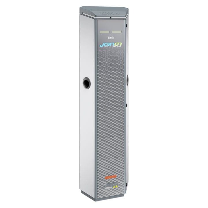 Per quanto riguarda le soluzioni per uso pubblico, fanno parte di JOINON la colonnina I-On (43 cm di larghezza, 155 cm di altezza e 23,1 cm di profondità) e l’unità a parete I-On Wall (43 x 61,4 x 23,1 cm), entrambe pensate per la ricarica di auto elettriche nei parcheggi pubblici. Sono dispositivi resistenti agli urti, agli atti vandalici e agli agenti atmosferici (grado di protezione IP55) grazie all’involucro in lamiera d’acciaio verniciata con trattamento antigraffiti. Ciascuna unità è dotata di due prese antivandalo Tipo 2, protette da una chiusura e in grado di sopportare una corrente di 32 ampere a 400 volt, per la ricarica simultanea di due veicoli fino a 22 kW ciascuno.