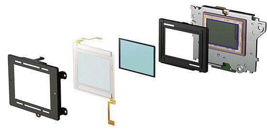 Il sistema di rimozionedella polvere. Il filtro antialiasing e il filtro UV / IR sono montati su un telaio mobile, posto davanti al sensore e in grado di vibrare ad alta frequenza. Le microvibrazioni sono sufficienti a far cadere le particelle che si depositano.