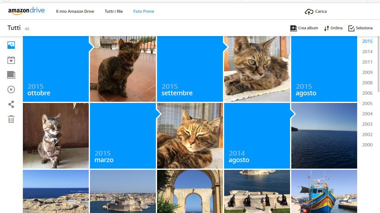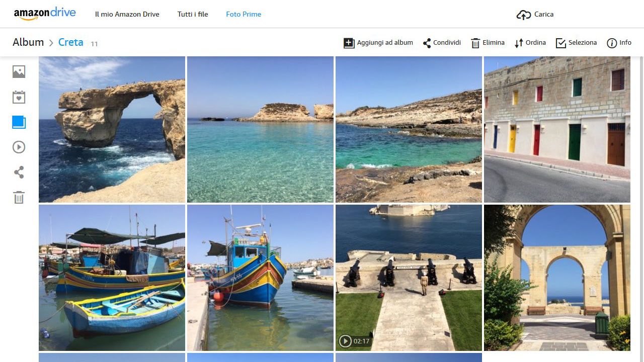 Il caricamento delle foto e dei video è possibile con le modalità consuete, a cui si aggiunge l’uploader di Amazon da installare nel computer per rendere più comoda – e automatica – l’operazione. L’interfaccia di Foto Prime è migliorabile, poiché si tratta di un’estensione di Amazon Drive da cui eredita lo stile, ovviamente non pensato in origine per la gestione delle foto quanto piuttosto per file generici. La pagina principale mostra le foto caricate sotto forma di una scacchiera, disposta verticalmente in ordine temporale, con gli anni elencati sul bordo destro e con riquadri colorati che scandiscono i mesi, disposti tra le miniature delle immagini; l’effetto complessivo è piacevole, ma se gli scatti sono molto diradati nel tempo questa disposizione diventa un po’ dispersiva. Gli album – senza vincoli di numero e immagini – sono più compatti e sfoggiano secondo noi una composizione grafica più classica e gradevole; è inoltre possibile caricare anche i video, memorizzati però in una cartella dedicata separata. L’utente può condividere le immagini (massimo 25 per volta, oppure album interi) su Facebook e Twitter, nonché inviare un link ai destinatari preferiti.
