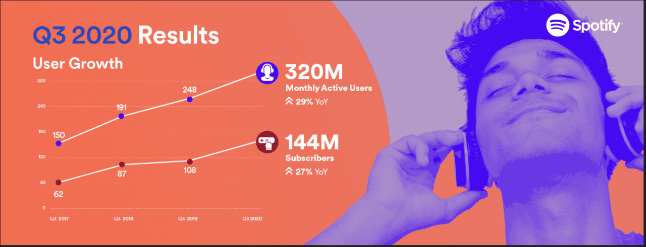 Nel terzo trimestre del 2020, dice Spotify, il numero di utenti complessivamente attivi ogni mese ha superato i 320 milioni. Una crescita incontestabile, con un solido +29%, rispetto allo stesso periodo dell’anno scorso. Il pubblico è in aumento sia sul fronte degli abbonamenti a pagamento che su quello dell’offerta gratuita finanziata dalla pubblicità.