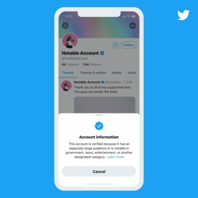 Twitter ha comunicato che le nuove regole per gli account verificati entreranno in vigore dal 20 gennaio 2021. Per ottenere il famoso badge di colore blu dovranno essere soddisfatti determinati requisiti. L’azienda californiana ha fornito inoltre alcuni dettagli sulla procedura e svelato i nuovi badge per bot e account commemorativi.