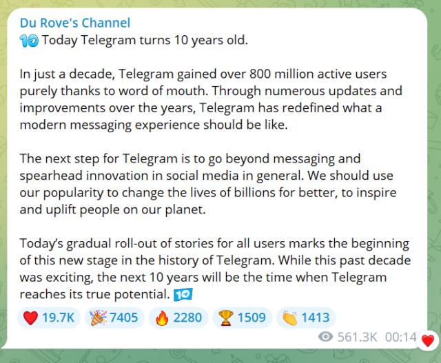 “L’implementazione graduale delle Storie di oggi a tutti gli utenti segna l’inizio di una nuova fase nella storia di Telegram“, scrive il fondatore di Telegram Pavel Durov.