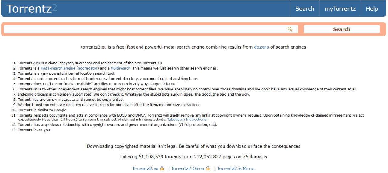 Con un indice composto da decine di milioni di torrent, Torrentz2.eu è al momento una delle risorse di ricerca più utili e popolari presso gli utenti del P2P a mezzo BitTorrent. In attesa del palesarsi dei “persecutori” della nuova incarnazione di Torrentz, il metamotore continua a operare senza il minimo problema tramite il dominio alternativo torrentz2.is.
