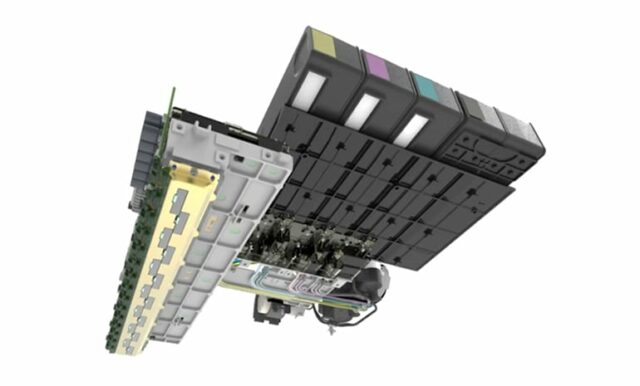 Per stampare sull’intera larghezza di un foglio A4 in un colpo solo, la testina è dotata di ben 42.240 ugelli, 10.560 per ognuno dei quattro colori Cmyk. Questi ugelli sono raggruppati in dieci matrici, con ciascuna che ne contiene 4.224, disposti su otto righe, due per ogni tinta. Ogni riga è formata quindi da 528 ugelli. Le matrici sono disposte su due file sfalsate, con l’area di azione di ogni matrice parzialmente sovrapposta a quelle delle matrici limitrofe, per una larghezza pari a 30 ugelli. Questa configurazione permette di ottenere stampe uniformi con una densità di punti pari a 1.200 dpi su tutto il foglio.