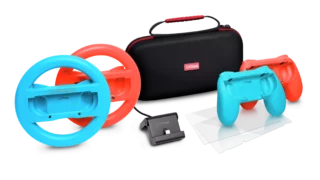 Contenuto del pacchetto: custodia rigida, 2 impugnature Joy-Con, 2 volanti, vetro temperato per Switch e Switch OLED, supporto di ricarica, cavo USB-C-A, manuale utente.