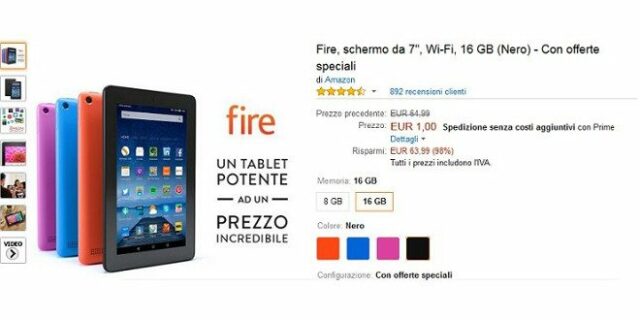 : l’errore di Amazon potrebbe costare caro al colosso di Seattle. Il 17 maggio, nel marketplace di Amazon, il Kindle Fire era “offerto” a 1 euro (contro i 54,99 (8GB) / 64,99 (16GB)) e per molti, che pensavano a una super-promozione, c’è stata una corsa all’acquisto.