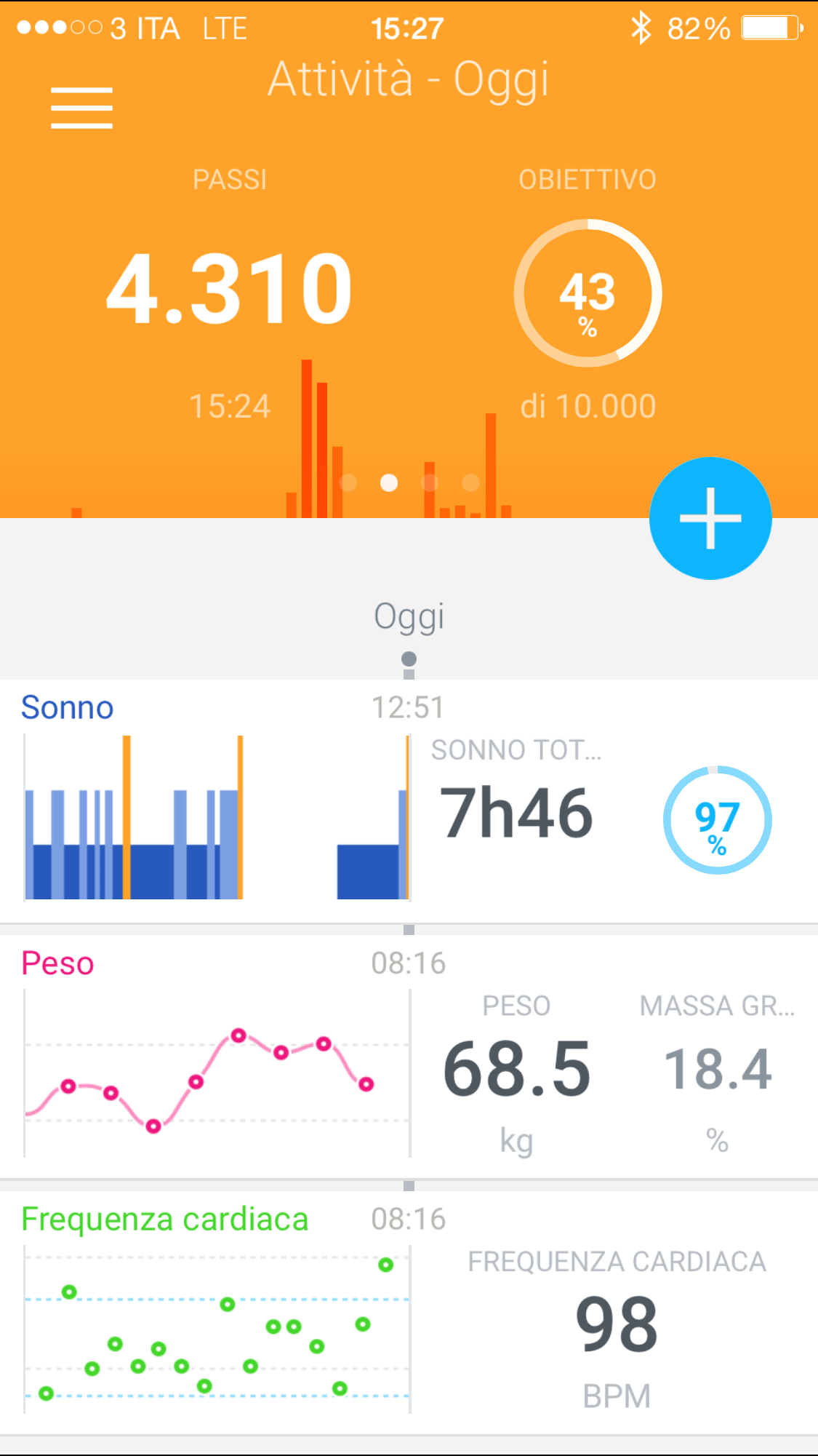 - La videata principale dell’app per iOS, che raggruppa tutti i dati acquisiti dai vari prodotti Withings