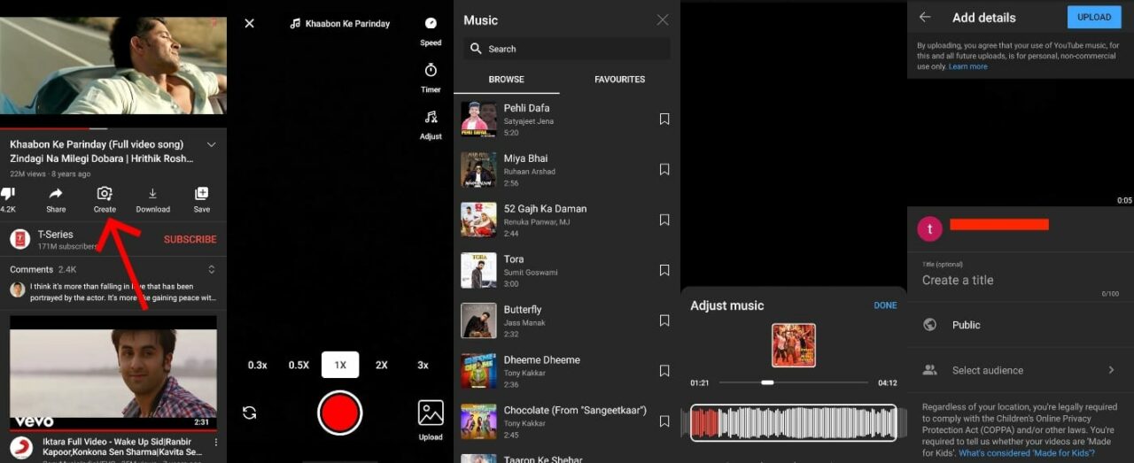 Il bottone Crea di YouTube appare sotto una determinata selezione di video musicali e permette agli utenti di creare dei video da 15 secondi, senza lasciare la schermata. Dopo aver cliccato il pulsante, l‘app apre la fotocamera interna per far sì che gli utenti possano realizzare un video con la musica selezionata. Altrimenti è possibile importare un video dalla galleria. Bisogna sottolineare che non tutti i video musicali avranno questa funzione tuttavia, per questioni di licenza.