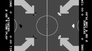 Era logico quindi che l’industria dei videogiochi, già ai suoi albori, puntasse forte sul mondo del calcio e dello sport in generale, infatti, il primo videogioco mai creato, Pong (Atari, 1972) era un simulatore di Ping Pong. Non si dovette attendere molto per vedere il calcio riprodotto in forma digitale, fu la stessa Atari a portare la prima esperienza calcistica virtuale nelle sale giochi con Atari Soccer (Atari, 1979). Il gioco presentava una grafica in bianco e nero su uno schermo a orientamento orizzontale che permetteva di giocare insieme ad altri tre amici. Il cabinato infatti era di tipo a “Isola”, ovvero un tavolo con lo schermo centrale e i comandi sui lati. L’inquadratura prendeva una porzione molto ampia del campo che sfiorava le due lunette quando il gioco si svolgeva al centro oppure tutta la metà del campo quando l’azione si faceva concitata nell’aria di rigore. Nel campo virtuale erano presenti otto calciatori, rispettivamente un giocatore arretrato, due avanzati e il portiere.