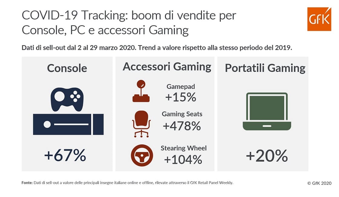 Analizzando i dati delle vendite online e offline nel periodo compreso tra il 2 e il 29 marzo 2020, GfK ha registrato un trend in netta crescita per il business del gaming in Italia: rispetto allo stesso periodo dell’anno scorso, gli utenti hanno acquistato un 67% in più di console, +15% di gamepad, +104% di volanti; le sedie dedicate per il gaming sono addirittura cresciute di un quasi incredibile +478%.
