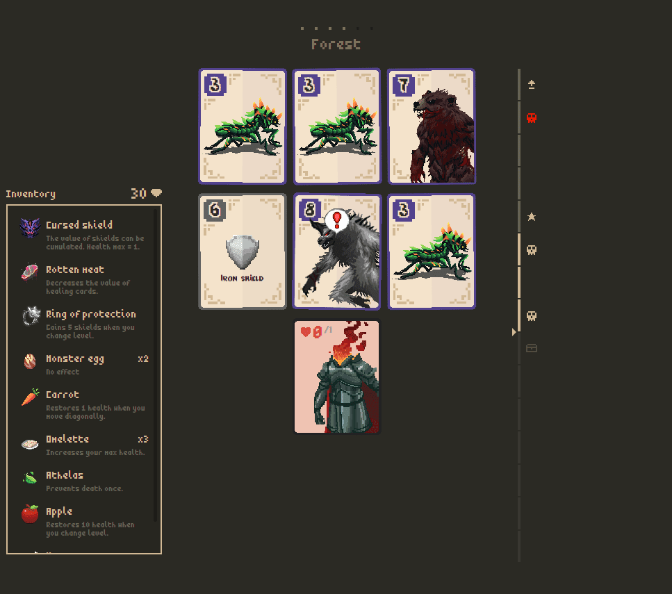 Cominciare a giocare a Forward è facile e intuitivo: la carta del proprio personaggio va trascinata col mouse sempre in avanti (“forward” appunto), in verticale o in diagonale, raccogliendo le carte-oggetto in grado di influenzare il gioco in maniera positiva (scudi, pozioni di salute, anelli magici ecc.) o negativa (scudi maledetti, “carne marcia”, fossili attira-mostri o altro). L’interazione coi mostri può avvenire in maniera diretta, attaccando direttamente con la nostra carta-personaggio, oppure in maniera indiretta “atterrando” davanti alla carta corrispondente.