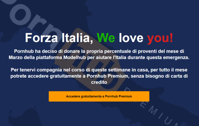 Uno dei portali pornografici più popolari al mondo – con buona pace di chi lo considera uno dei nemici giurati dell’industria – ha infatti preparato un’offerta specifica per gli italiani, concedendo l’accesso gratuito per un mese alla piattaforma di contenuti esclusivi nota come Pornhub Premium. Basta registrare un account dall’Italia e il sito sarà accessibile nella sua interezza fino ai primi di aprile.